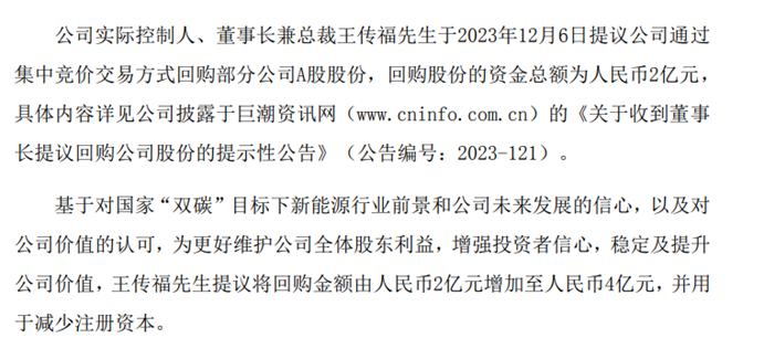 比亚迪实际控制人、董事长兼总裁王传福于2023年12月6日提议公司通过集中竞价交易方式回购部分公司A股股份,回购股份的资金总额为2亿元。基于对国家“双碳”目标下新能源行业前景和公司未来发展的信心,以及对公司价值的认可,王传福在2024年2月23日又提议将回购金额由2亿元增加至4亿元。