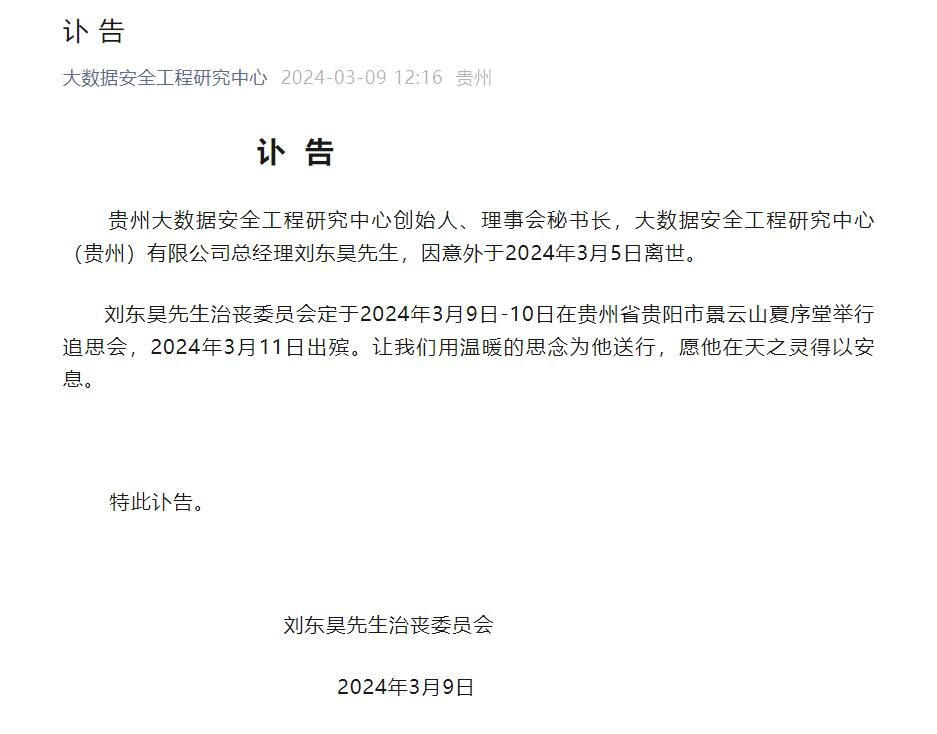 3月9日午间,大数据安全工程研究中心(贵州)有限公司发布讣告:贵州大数据安全工程研究中心创始人、理事会秘书长,大数据安全工程研究中心(贵州)有限公司总经理刘东昊,因意外于2024年3月5日离世。