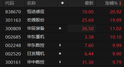 上证报中国证券网讯 4月10日早盘,工业母机板块冲高。9时40分,恒进感应涨超20%炒股配资安全,宏德股份20CM涨停,华辰装备涨超11%,华东重机、华东数控等涨停。