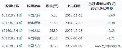 A股5只保险股集体下跌,截至收盘,中国太保下跌2.83%,中国人保下跌2.6%,中国平安下滑1.71%;两家上市寿险公司股价下跌幅度较小,中国人寿、新华保险分别下滑0.49%和0.38%。