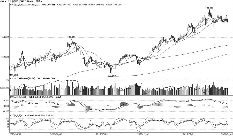 T加权延续振荡调整走势,近期量仓等指标转弱。周一早盘低开低走维持低位振荡走势,临近尾盘弱势尽显,以小阴线报收。T主连合约大幅减仓,远月合约则小幅加仓。T加权MACD指标绿柱前期收敛后有走扩迹象,KDJ快线开始转向低位,总体表现为减仓振荡。关注调整幅度,建议观望为主。