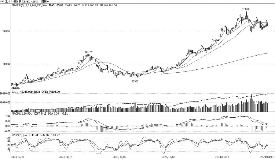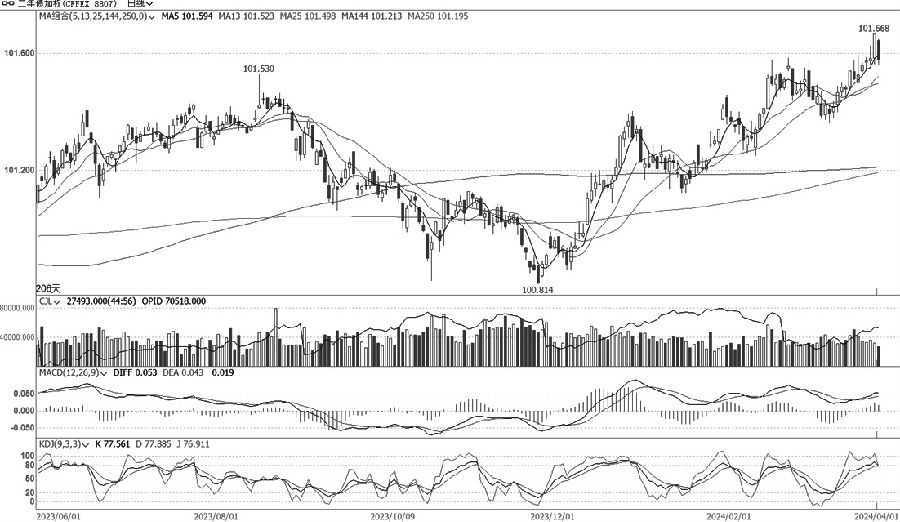 TL加权持续调整走势有所反复,压力有限且量仓等指标不弱。周一早盘低开低走,以小阴线报收。TL主连合约小幅减仓,远月合约略加仓。量价仓等指标分化减弱,TL加权MACD绿柱继续收窄,KDJ快线中位运行股票配资监管,日K线验证短期均线支撑力度,建议多单谨慎持有。(田瑞期货投资咨询证编号TZ008852)
